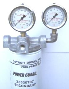 FUEL PRESSURE FOR SECONDARY FUEL FILTER DETROIT DIESEL 0-100 PSI FOR FUEL PRESSURE OF AROUND 52 PSI 2.5" OIL FILLED 1/4" NPT MADE USA STAINLESS STEEL CASE GAUGE $30.00 FILTER HEAD $45.00
